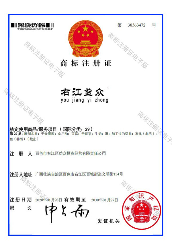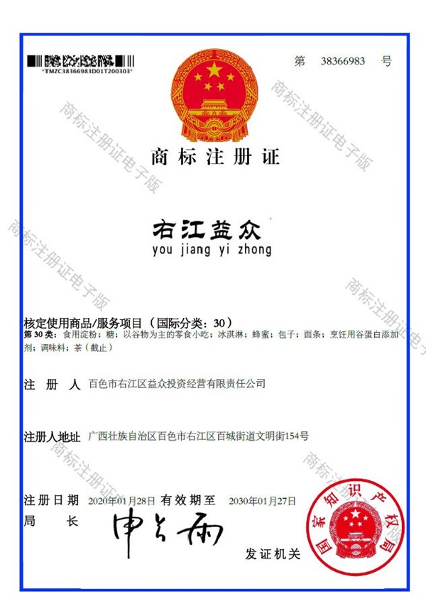 日前,廣西百色益眾投資有限公司注冊的“右江益眾”品牌商標(biāo)正式獲得國家知識(shí)產(chǎn)權(quán)局批準(zhǔn),為企業(yè)樹立品牌形象,推進(jìn)企業(yè)品牌升級(jí)提供了有力抓手。