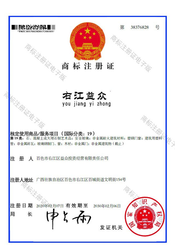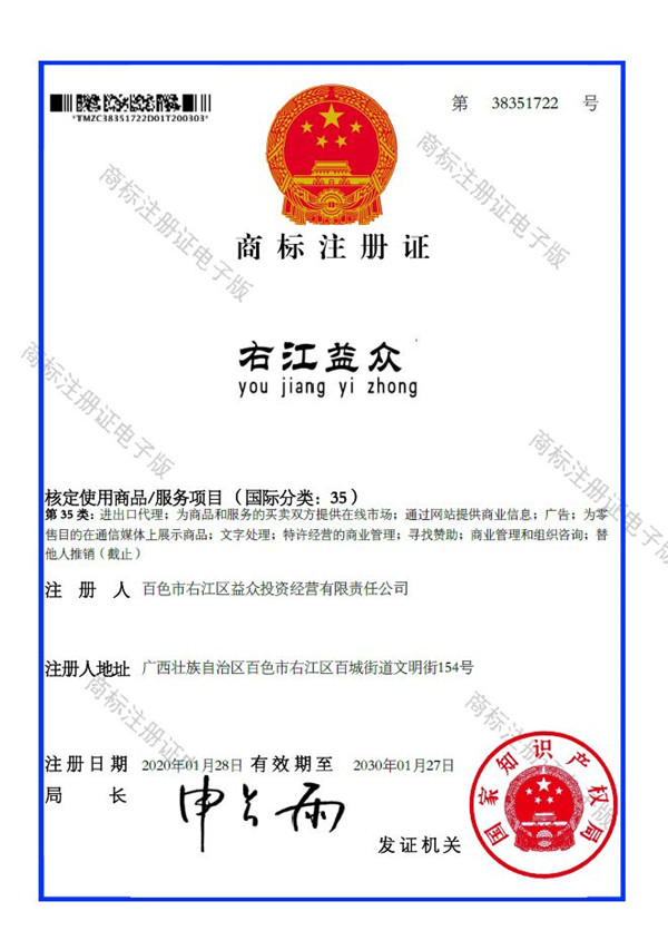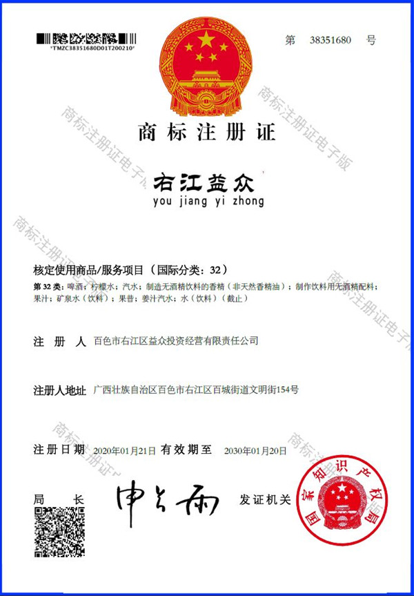 2019年4月,為樹立企業(yè)品牌形象,充分展現(xiàn)品牌價(jià)值,廣西百色益眾投資有限公司按照建設(shè)現(xiàn)代企業(yè)的方向和標(biāo)準(zhǔn),啟動(dòng)品牌商標(biāo)注冊申報(bào)工作,經(jīng)過6個(gè)月的審核期和3個(gè)月的公告期,“右江益眾”45個(gè)大類商標(biāo)品牌第一時(shí)間成功獲批?!坝医姹姟逼放频某晒ψ?,有利于公司更好地參與市場競爭,同時(shí),對(duì)于強(qiáng)化企業(yè)內(nèi)部管理、樹立良好的企業(yè)形象、提升公司美譽(yù)度也可起到積極的助推作用。
