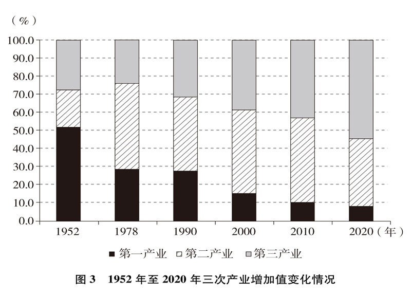 產(chǎn)業(yè)結(jié)構(gòu)優(yōu)化升級。中國已建成世界上最完整的產(chǎn)業(yè)體系,產(chǎn)業(yè)發(fā)展持續(xù)向中高端邁進(jìn)。三次產(chǎn)業(yè)增加值之比從1952年的50.5∶20.8∶28.7到2020年的7.7∶37.8∶54.5,中國從傳統(tǒng)農(nóng)業(yè)大國成為工業(yè)大國、服務(wù)業(yè)大國(圖3),中國經(jīng)濟從依賴單一產(chǎn)業(yè)為主轉(zhuǎn)向依靠三次產(chǎn)業(yè)共同帶動。農(nóng)業(yè)現(xiàn)代化成效顯著,機械化、數(shù)字化、綠色化、功能化、共享化水平明顯提高,廣大農(nóng)民逐步告別“面朝黃土背朝天、一身力氣百身汗”的辛勞,農(nóng)村生產(chǎn)力極大解放;糧食生產(chǎn)能力穩(wěn)步提升,實現(xiàn)谷物基本自給,中國人把飯碗牢牢端在自己手中。中國建成門類齊全、獨立完整的現(xiàn)代工業(yè)體系,工業(yè)化和信息化融合發(fā)展的廣度和深度不斷拓展,“中國制造”向“中國智造”轉(zhuǎn)型升級,產(chǎn)業(yè)鏈供應(yīng)鏈現(xiàn)代化水平進(jìn)一步提升。以新一代信息技術(shù)、生物技術(shù)、高端裝備、綠色環(huán)保為代表的戰(zhàn)略性新興產(chǎn)業(yè)發(fā)展迅速,成為引領(lǐng)高質(zhì)量發(fā)展的重要引擎。數(shù)字經(jīng)濟激發(fā)經(jīng)濟發(fā)展新活力,產(chǎn)業(yè)數(shù)字化和數(shù)字產(chǎn)業(yè)化趨勢加快?,F(xiàn)代服務(wù)業(yè)加速發(fā)展,以“互聯(lián)網(wǎng)+”為標(biāo)志的新業(yè)態(tài)、新模式層出不窮,平臺經(jīng)濟、共享經(jīng)濟蓬勃興起,生產(chǎn)性服務(wù)業(yè)向?qū)I(yè)化和高端化發(fā)展,生活性服務(wù)業(yè)向精細(xì)化和高品質(zhì)轉(zhuǎn)變。產(chǎn)業(yè)結(jié)構(gòu)的優(yōu)化升級促進(jìn)了經(jīng)濟更加均衡、更加充分的發(fā)展,人們個性化品質(zhì)化多樣化需求不斷得到滿足。