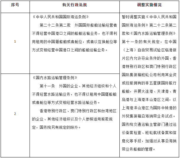 一、按照《中國(上海)自由貿(mào)易試驗區(qū)臨港新片區(qū)總體方案》,同意自即日起至2024年12月31日,在中國(上海)自由貿(mào)易試驗區(qū)臨港新片區(qū)暫時調(diào)整實施《中華人民共和國國際海運(yùn)條例》《國內(nèi)水路運(yùn)輸管理條例》的有關(guān)規(guī)定(目錄附后)。