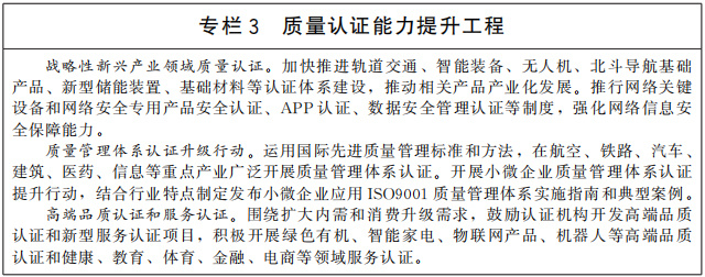 提高質(zhì)量認(rèn)證服務(wù)能力。加快構(gòu)建統(tǒng)一管理、共同實(shí)施、權(quán)威公信、通用互認(rèn)的質(zhì)量認(rèn)證體系,全面提升質(zhì)量認(rèn)證服務(wù)能力,打造一批具有國(guó)際競(jìng)爭(zhēng)力的認(rèn)證品牌。推動(dòng)完善重點(diǎn)產(chǎn)業(yè)質(zhì)量認(rèn)證制度體系,加大網(wǎng)絡(luò)安全認(rèn)證制度推行力度,加快戰(zhàn)略性新興產(chǎn)業(yè)領(lǐng)域質(zhì)量認(rèn)證制度建設(shè),大力推行高端品質(zhì)認(rèn)證和新型服務(wù)認(rèn)證,加快研究和完善國(guó)家數(shù)據(jù)安全標(biāo)準(zhǔn)與認(rèn)證認(rèn)可體系。廣泛開(kāi)展質(zhì)量管理體系認(rèn)證升級(jí)行動(dòng)。健全政府、行業(yè)、社會(huì)等多層面的認(rèn)證采信機(jī)制,推動(dòng)在市場(chǎng)采購(gòu)、行業(yè)管理、行政監(jiān)管、社會(huì)治理等領(lǐng)域廣泛采信認(rèn)證結(jié)果。提升認(rèn)證行業(yè)專業(yè)化集約化水平,優(yōu)化行業(yè)布局結(jié)構(gòu),推動(dòng)認(rèn)證行業(yè)數(shù)字化發(fā)展。