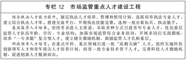 加強(qiáng)人才隊(duì)伍建設(shè)。健全人才引進(jìn)、培養(yǎng)、使用、評(píng)價(jià)、激勵(lì)機(jī)制,統(tǒng)籌推進(jìn)市場(chǎng)監(jiān)管人才隊(duì)伍建設(shè)。加快高水平市場(chǎng)監(jiān)管智庫(kù)和綜合型研究機(jī)構(gòu)建設(shè),加強(qiáng)重大理論和實(shí)踐問(wèn)題戰(zhàn)略研究、決策咨詢,開(kāi)展人才需求分析。推進(jìn)市場(chǎng)監(jiān)管人才培養(yǎng),加快相關(guān)學(xué)科專業(yè)建設(shè),培養(yǎng)符合市場(chǎng)監(jiān)管現(xiàn)代化需求的后備人才。在檢驗(yàn)檢測(cè)、藥品審評(píng)、檢查核查、網(wǎng)絡(luò)數(shù)據(jù)監(jiān)管、知識(shí)產(chǎn)權(quán)、質(zhì)量技術(shù)等重點(diǎn)專業(yè)領(lǐng)域,著力培養(yǎng)引進(jìn)一批“高精尖缺”人才。組織開(kāi)展綜合執(zhí)法大練兵,提升基層人才隊(duì)伍能力水平。加強(qiáng)市場(chǎng)監(jiān)管文化建設(shè),增進(jìn)價(jià)值認(rèn)同、情感認(rèn)同、文化認(rèn)同,增強(qiáng)做好市場(chǎng)監(jiān)管工作的責(zé)任感和使命感。