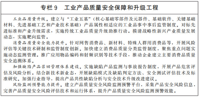 加大消費(fèi)品安全監(jiān)管力度。推動(dòng)企業(yè)建立主要消費(fèi)品質(zhì)量安全追溯體系,記錄重點(diǎn)環(huán)節(jié)過(guò)程信息,實(shí)現(xiàn)產(chǎn)品質(zhì)量安全問(wèn)題可追溯。健全缺陷產(chǎn)品召回制度,加強(qiáng)大中型客貨車、新能源汽車與智能網(wǎng)聯(lián)汽車、智能家居、兒童用品、電子電器等重點(diǎn)產(chǎn)品召回管理,強(qiáng)化重大案件調(diào)查與召回后續(xù)監(jiān)督工作,完善缺陷產(chǎn)品召回技術(shù)支撐體系。完善產(chǎn)品傷害監(jiān)測(cè)制度,拓寬監(jiān)測(cè)信息采集渠道,增加監(jiān)測(cè)點(diǎn),推進(jìn)產(chǎn)品傷害預(yù)防干預(yù)。完善產(chǎn)品質(zhì)量安全事故強(qiáng)制報(bào)告和調(diào)查處理制度,提高質(zhì)量安全事故人身傷害賠償標(biāo)準(zhǔn)。