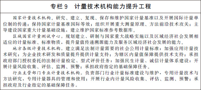 (二十一)加快計量技術機構建設。深化計量技術機構改革創(chuàng)新發(fā)展,優(yōu)化整合國家計量技術機構、區(qū)域國家計量測試中心、地方各級計量技術機構和行業(yè)主管部門專業(yè)計量技術機構。大力推動國家計量技術機構創(chuàng)新發(fā)展,通過組織開展重大測量原理、方法前沿技術攻關,建立量子計量基準并保持國際等效,提供一流的量值溯源和測量服務,支撐國家科技創(chuàng)新、工業(yè)競爭力提升和經濟社會發(fā)展。充分發(fā)揮省級人民政府和行業(yè)主管部門計量基礎設施規(guī)劃建設自主權,加強普惠性、基礎性和公益性計量基礎設施建設。提升計量技術機構服務市場的能力和水平,推動形成一批專業(yè)領域服務平臺,培育一批專業(yè)化、社會化、網(wǎng)絡化的服務機構,為經濟社會發(fā)展和行業(yè)創(chuàng)新提供計量測試服務。