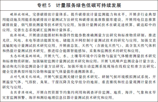 (十四)支撐碳達峰碳中和目標實現(xiàn)。完善溫室氣體排放計量監(jiān)測體系,加強碳排放關鍵計量測試技術研究和應用,健全碳計量標準裝置,為溫室氣體排放可測量、可報告、可核查提供計量支撐。建立碳排放計量審查制度,強化重點排放單位的碳計量要求。在城市和園區(qū)開展低碳計量試點。建立完善資源環(huán)境計量體系,建設一批國家能源、水文水資源和環(huán)境計量中心,推進能耗、水資源、環(huán)境監(jiān)測系統(tǒng)建設,加強能源資源和環(huán)境計量數(shù)據(jù)分析挖掘和利用。加快推進能源資源計量服務示范工程建設,引導和培育能源資源和環(huán)境計量服務市場。