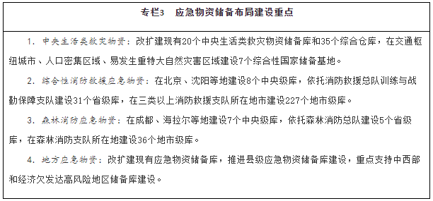 加強(qiáng)物資實(shí)物儲(chǔ)備。完善中央、省、市、縣、鄉(xiāng)五級(jí)物資儲(chǔ)備布局,建立健全包括重要民生商品在內(nèi)的應(yīng)急物資儲(chǔ)備目錄清單,合理確定儲(chǔ)備品類、規(guī)模和結(jié)構(gòu)并動(dòng)態(tài)調(diào)整。建立完善應(yīng)急物資更新輪換機(jī)制。擴(kuò)大人口密集區(qū)域、災(zāi)害事故高風(fēng)險(xiǎn)區(qū)域和交通不便區(qū)域的應(yīng)急物資儲(chǔ)備規(guī)模,豐富儲(chǔ)備物資品種、完善儲(chǔ)備倉(cāng)庫(kù)布局,重點(diǎn)滿足流域大洪水、超強(qiáng)臺(tái)風(fēng)以及特別重大山洪災(zāi)害應(yīng)急的物資需要。支持政企共建或委托企業(yè)代建應(yīng)急物資儲(chǔ)備庫(kù)。