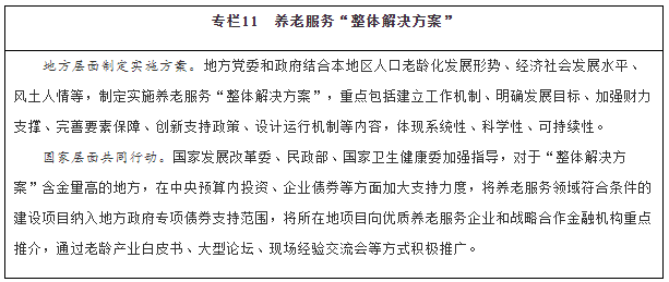 各?。ㄗ灾螀^(qū)、直轄市)要根據(jù)人口老齡化發(fā)展形勢(shì),制定實(shí)施專項(xiàng)規(guī)劃,加強(qiáng)與相關(guān)規(guī)劃銜接。各級(jí)老齡工作委員會(huì)要發(fā)揮統(tǒng)籌協(xié)調(diào)作用,推動(dòng)老齡工作委員會(huì)各成員單位履職盡責(zé),形成工作合力。發(fā)揮養(yǎng)老服務(wù)聯(lián)席會(huì)議制度作用,推進(jìn)養(yǎng)老服務(wù)體系建設(shè),強(qiáng)化區(qū)域養(yǎng)老服務(wù)資源統(tǒng)籌管理。支持城市群、都市圈打造養(yǎng)老服務(wù)體系一體化建設(shè)格局,形成服務(wù)能力銜接、產(chǎn)業(yè)發(fā)展協(xié)同的合作區(qū)域。支持大型城市和區(qū)域中心城市推動(dòng)養(yǎng)老產(chǎn)業(yè)集聚發(fā)展,充分發(fā)揮輻射帶動(dòng)和示范作用。推動(dòng)以地級(jí)行政區(qū)為單位制定“整體解決方案”,將老齡事業(yè)發(fā)展和養(yǎng)老服務(wù)體系建設(shè)納入經(jīng)濟(jì)社會(huì)發(fā)展全局中通盤考慮,全方位整合資源力量,充分調(diào)動(dòng)各方積極性,推動(dòng)兜底性、普惠型、多樣化三種路徑協(xié)同發(fā)展。